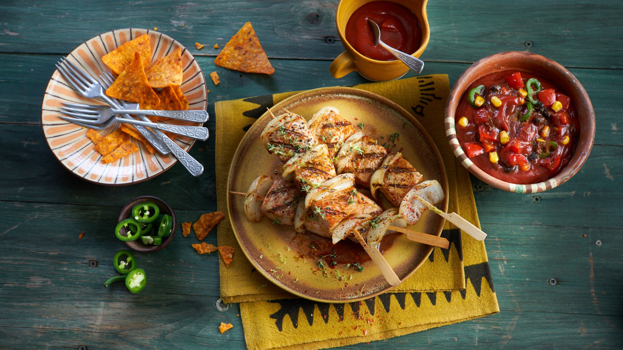 Für die Spieße Zitrone heiß waschen, dann trocknen und Schale fein reiben. Thymian von den Stielen streifen und fein schneiden. Zwiebeln abziehen und blättrig schneiden. Fleisch ca. 3.-4 cm groß würfeln und mit Zwiebelstücken abwechselnd auf Spieße stecken. Nach Wunsch auf dem Grill, in einer Grillpfanne oder in einer „normalen“ Pfanne zubereiten, dann mit Zitronenschale, Thymian, Salz sowie Pfeffer bestreuen.