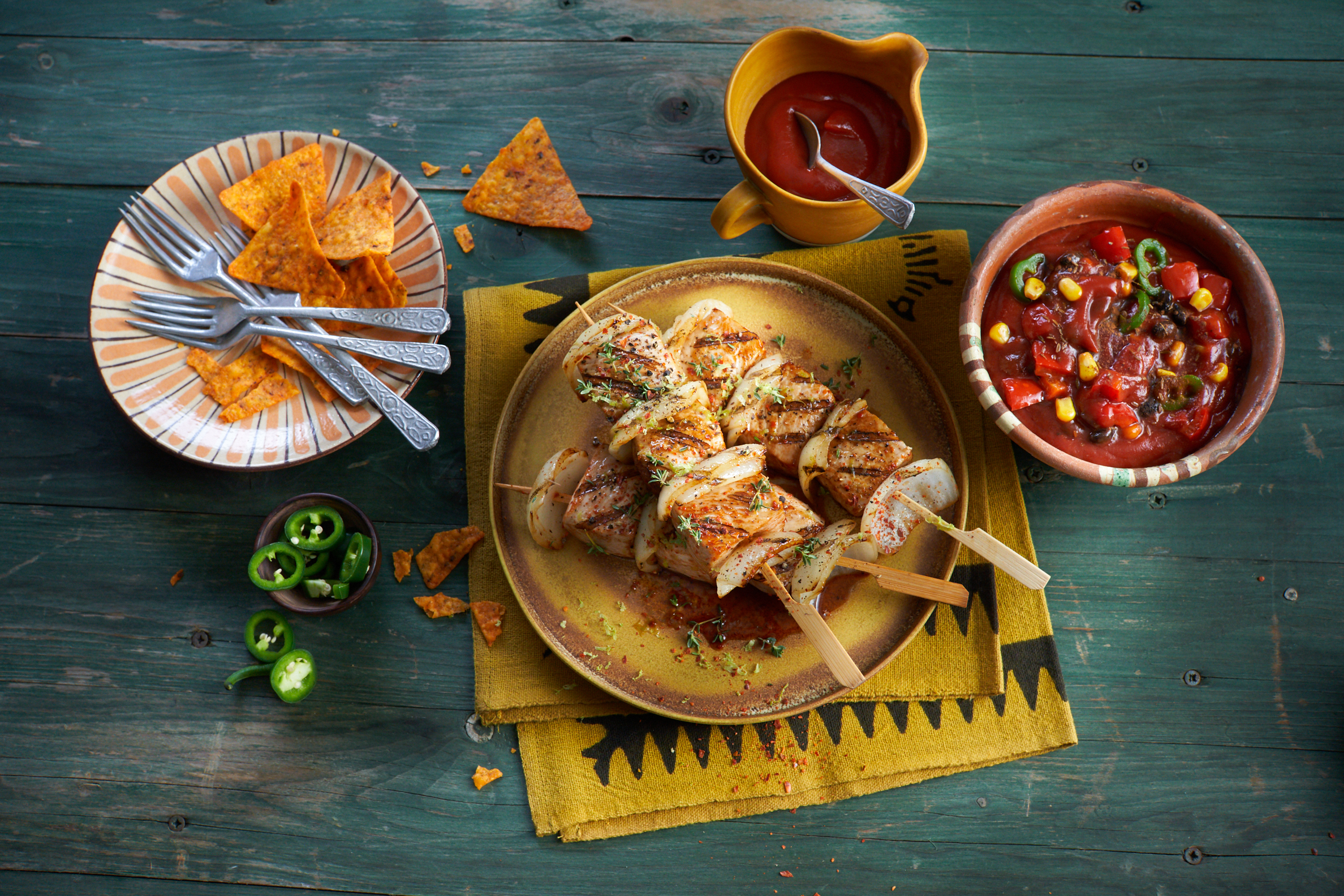 5. Mit der Tex Mex Salsa Sauce, jeweils zwei Streifen Tofu, Mais, Cheddar und Taco Chips vier Hot Dogs bauen. Nach Wunsch mit Koriander garnieren.