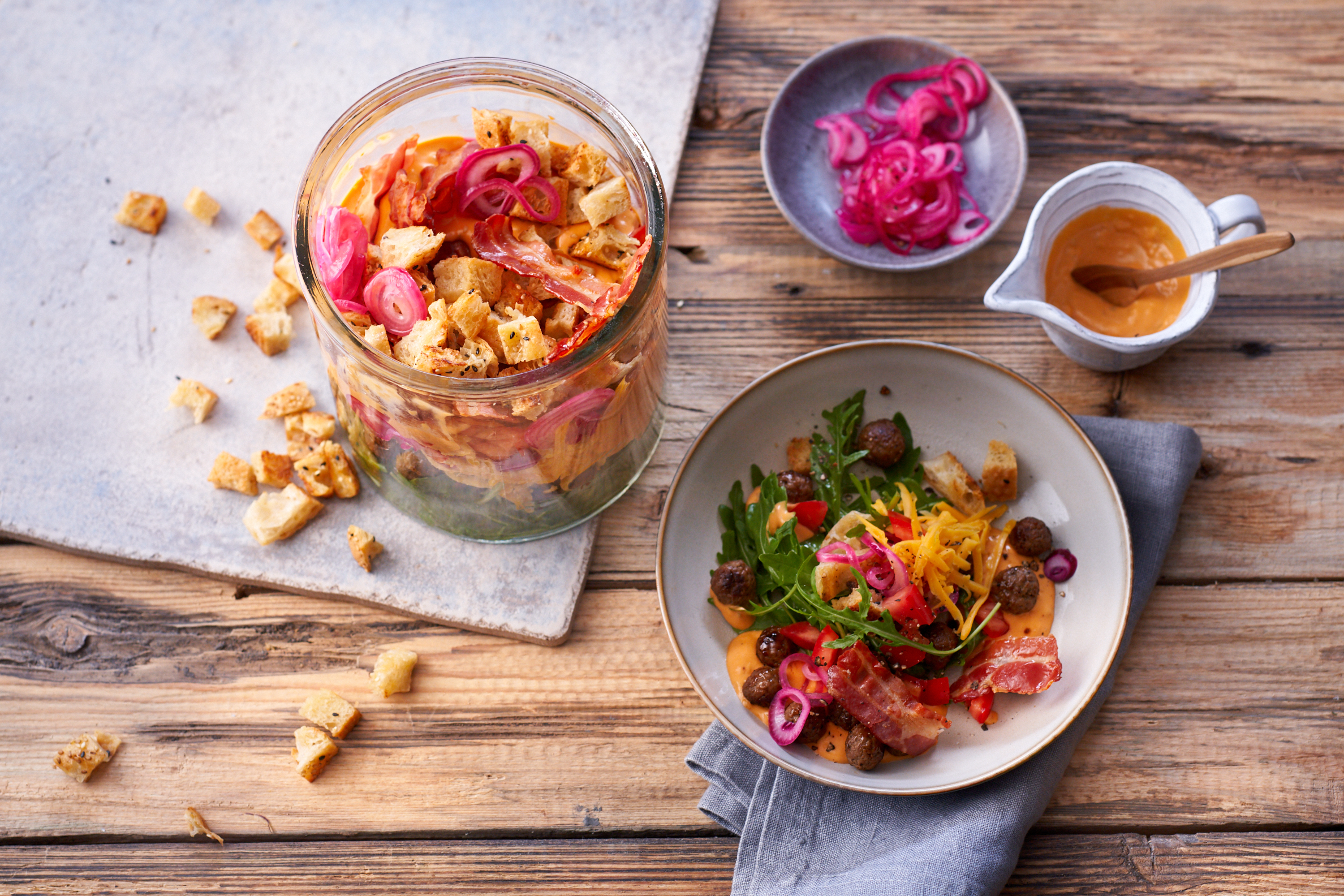 6. Pretzel-Dogs mit White BBQ Sauce anrichten und mit Zwiebelringen bestreuen.